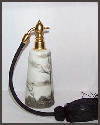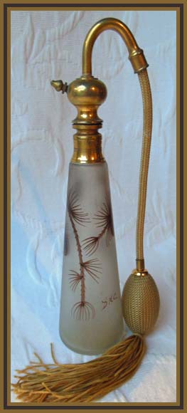 This Art Glass perfume atomizer stands 9" tall. The body is comprised of Satin Glass with hand-painted Pinecones hanging from their branches, in an understated nature motif. This bottle is signed on the side D A C; the metal hardware is embossed, A. H. DEPOSE PARIS. The collar is stamped, made in France.