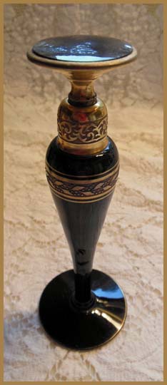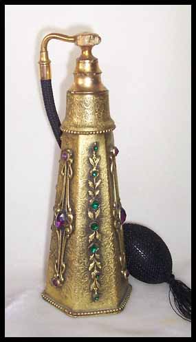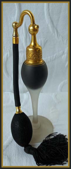 This elegant antique perfume atomizer stands 8" tall. The body of this perfume atomizer features a thick Rotten Gold finish accented with Black enamel. The footed base has the same Gold treatment. This bottle is a very heavy perfume bottle and is absolutely GORGEOUS. I believe it to be of French or Czechoslovakian origin. This elegant perfume atomizer would be an asset to any fine collection of antique perfume bottles.