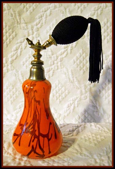 This unusual ART GLASS perfume bottle stands 6 1/2" in height. The bright Orange cased glass has random Black splatters over the entire bottle. In excellent condition, the metal hardware and the metal drawtube are present and original. I would date this unusual perfume atomizer in the 1920's and of Czechoslovakian origin. It is much nicer than the photos show and would make a great display piece or gift for the hard to please collector.