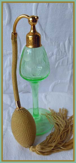 This 1920's perfume atomizer stands 6 1/4" tall. It is Green in color with wheel cut spheres used to decorate the glass. They look like bubbles! This perfume atomizer is in excellent condition. It is unsigned, however, it can be attributed to the DeVilbiss company by the metal hardware. It would be gorgeous on your dresser, or to use to apply your favorite fragrance. Oh la la ... ID=AM94B