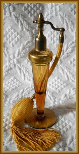 This vintage perfume atomizer stands 7 7/8" tall. It is amber in color with simple Gold lines as the decorations. Understated, yet elegant. In very good condition, I believe that this atomizer was made in the United States during the depression era. The hardware looks similar to that produced by Volupte or Pyramid ... ID=AM99A