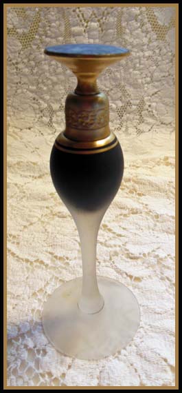 Standing 6 3/8" tall, the outside of the bottle is frosted satin glass. The inside of the bowl is reverse painted in ebony. The gold metal collar is beautifully embossed. In excellent condition, this perfume atomizer retains the ORIGINAL GLASS DRAWTUBE,